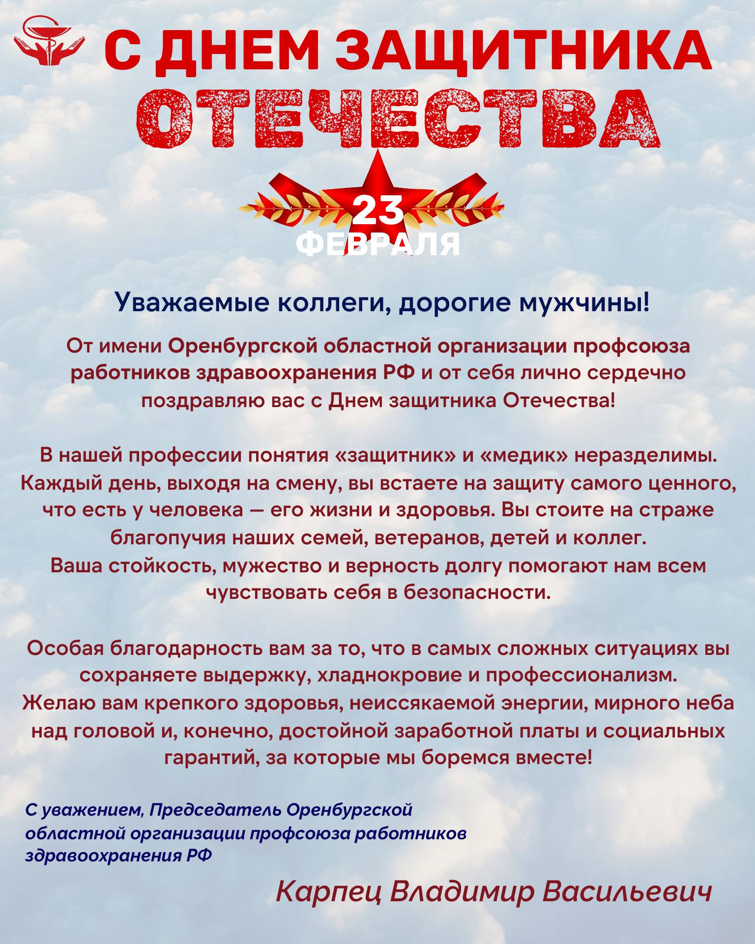 Наш Профсоюз – это двухмиллионная семья, которая вместе со всей страной вносит весомый вклад в ее процветание и благополучие. Мы уверенно смотрим в будущее, не сомневаемся в нашей Победе и в неизменности курса нашего государства!