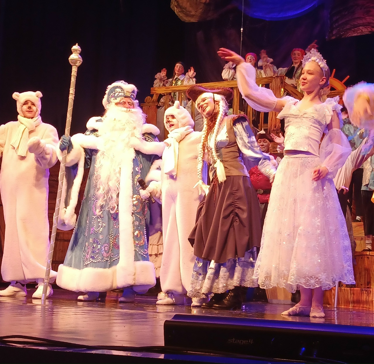 В этот день спектакль-мюзикл о приключениях Снегурочки на пиратском корабле посмотрели более 450 ребятишек и их родителей. Музыкальная новогодняя сказка о добре и вере в чудеса никого не оставила равнодушным. Дети и их родители вместе со сказочными героями приняли участие в интерактивной части спектакля: с большим удовольствием они разгадывали загадки, пели песенки и танцевали.