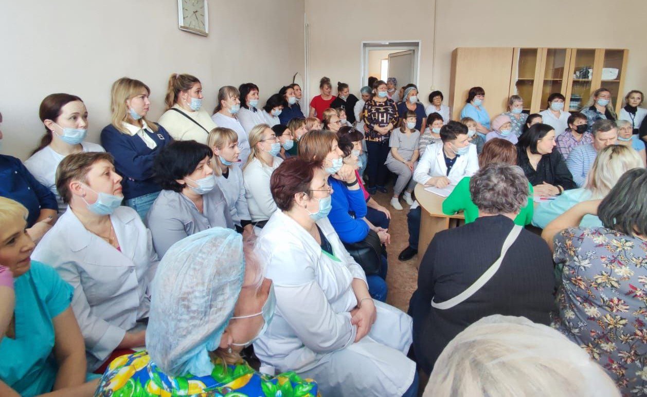Мероприятие получилось действительно масштабным — в зале собрались 90 медицинских работников, которые активно делились своими проблемами. За три с половиной часа от них поступило более 100 вопросов. Обсуждались кадровая обеспеченность, штатное расписание, условия труда, материально-техническое оснащение и обеспечение спецодеждой. Наши коллеги поднимали темы начисления стимулирующих выплат, доплат за работу в «режимных» кабинетах и премий, интересовались особенностями нагрузки для разных категорий сотрудников.
