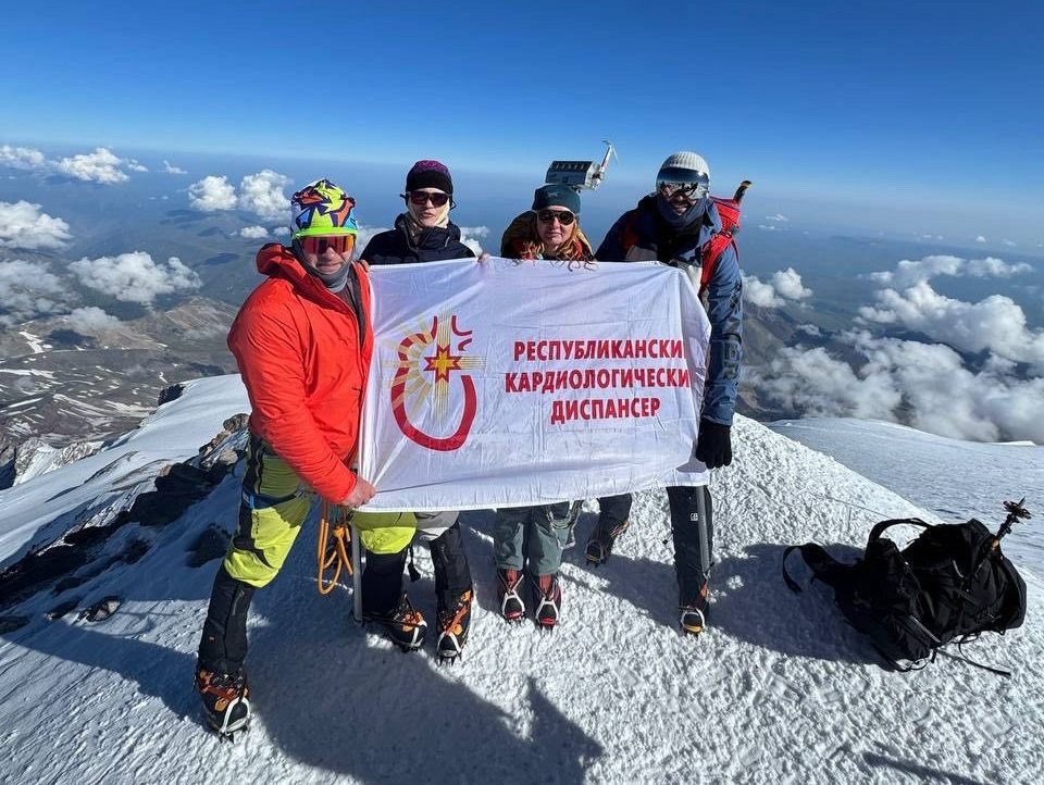 Трое наших отважных врачей, активные члены первичной профсоюзной организации Республиканского кардиологического диспансера, водрузили флаг учреждения на вершине Эльбруса!