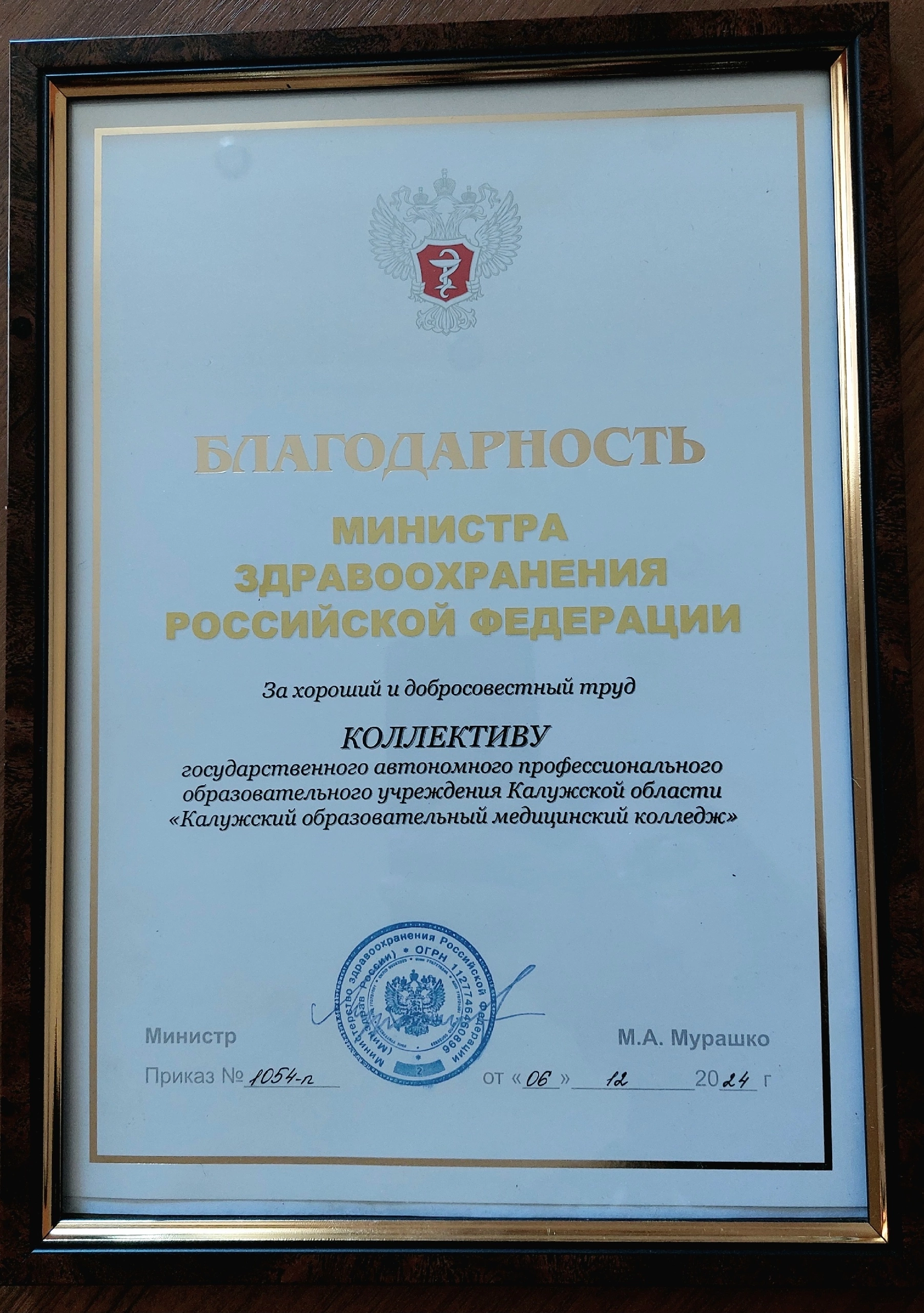 Коллектив калужского базового медицинского колледжа отмечен министром здравоохранения Российской федерации.
