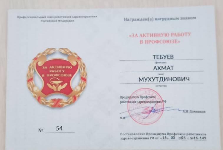 Председатель Профсоюза работников здравоохранения КЧР Ахмат Мухутдинович Тебуев награждён Нагрудным знаком «За активную работу в Профсоюзе», что является высшей оценки Профсоюза всей организации!