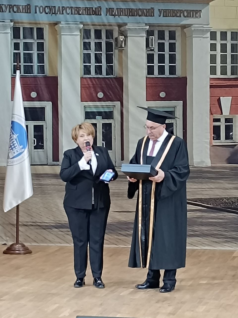 С трогательной речью выступила председатель Курской областной организации Профсоюза Светлана Охотникова и вручила ректору Виктору Лазаренко награду от имени Профсоюза "За содружество".