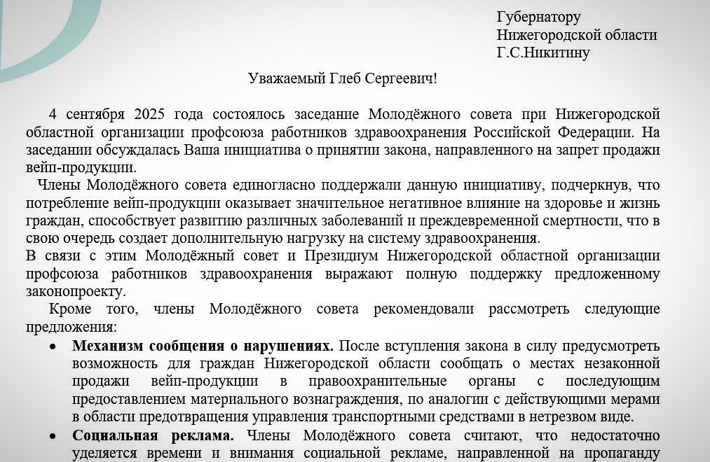Молодёжный совет Профсоюза работников здравоохранения Нижегородской области поддержал инициативу главы региона по ограничению продажи вейпов и электронных сигарет.