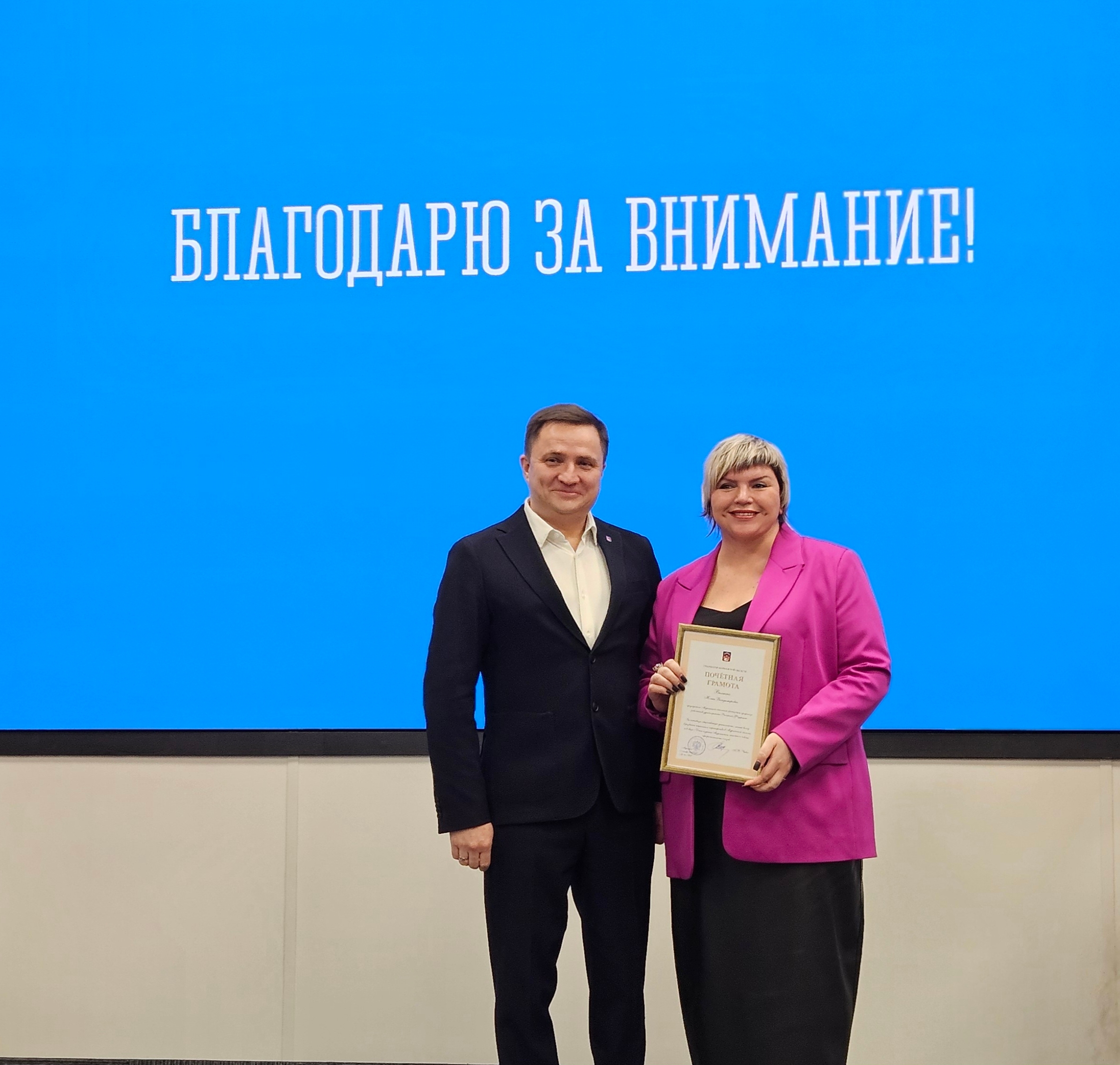 В торжественной обстановке заместитель Губернатора Мурманской области - министр здравоохранения Мурманской области Дмитрий Панычев вручил Почетную грамоту Губернатора Мурманской области председателю Обкома Профсоюза Юлии Величко.
