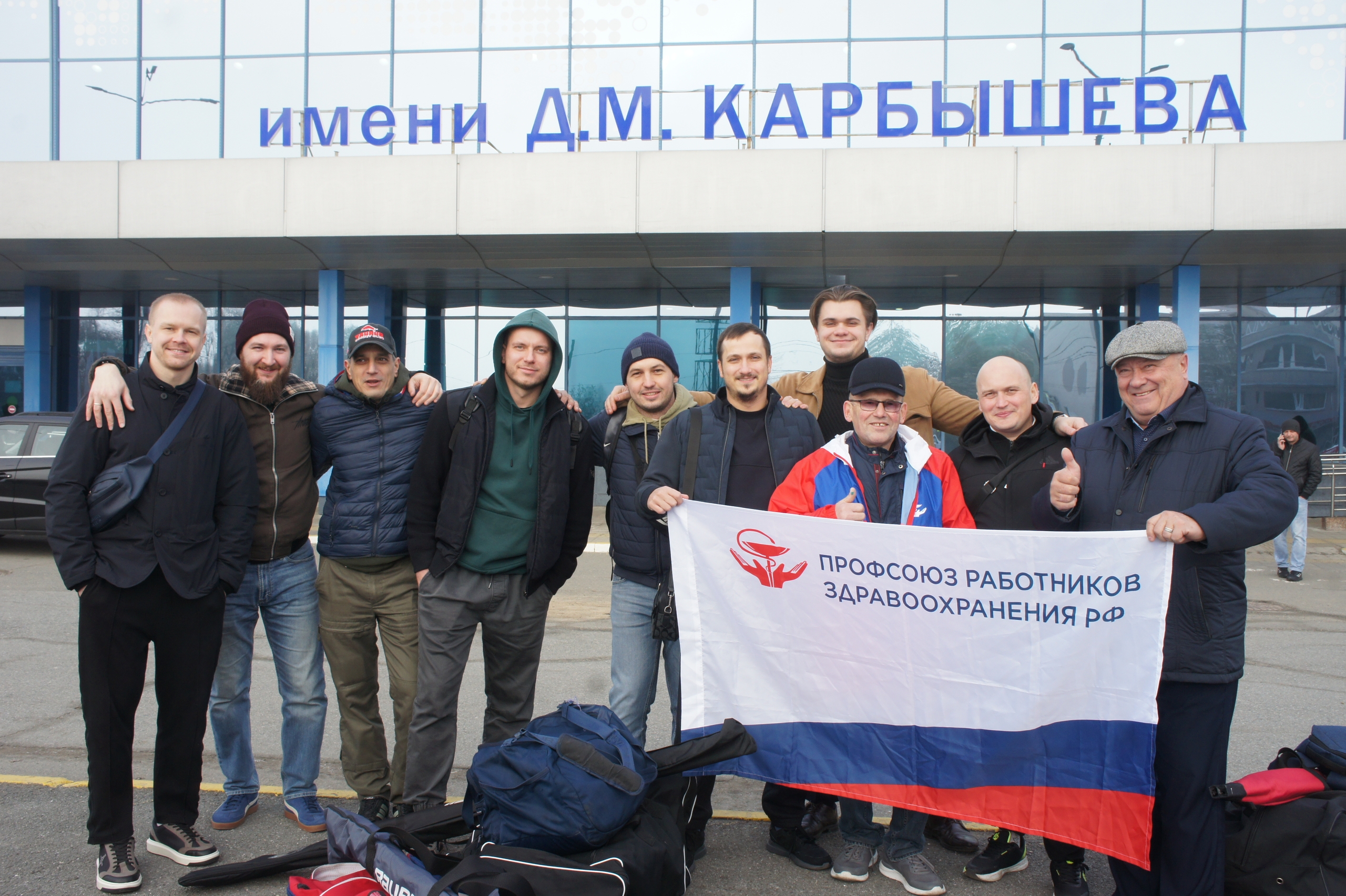 В аэропорту нашу команду проводил председатель обкома профсоюза С.В.Быструшкин.