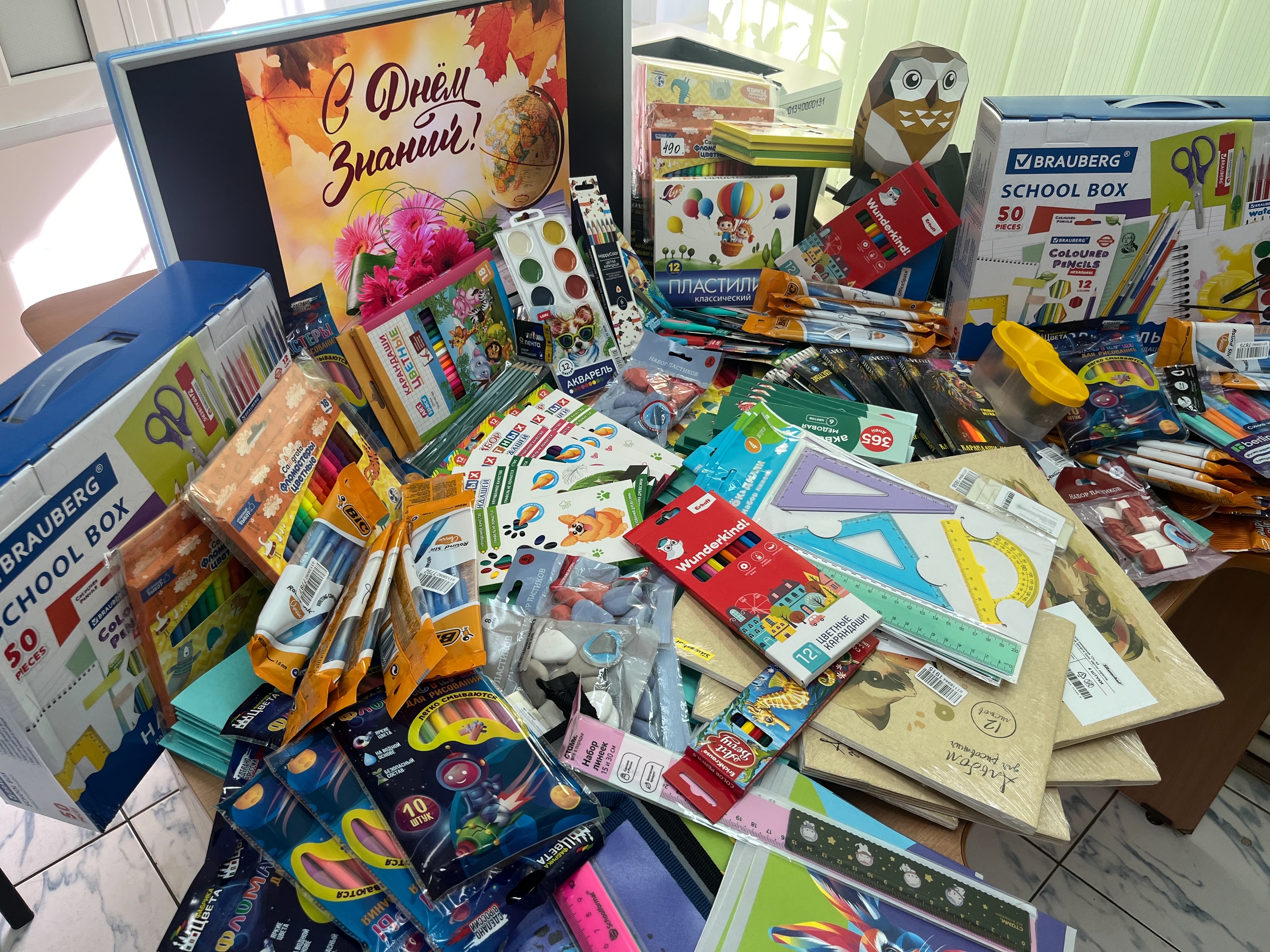 К новому учебному году для первоклассников были приобретены наборы школьника, состоящие из 50 наименований канцелярских товаров. Остальные ученики получат в подарок ручки, карандаши, фломастеры, краски, линейки, пластилин, ластики, альбомы, тетради и другие принадлежности для успешной учёбы и творчества.