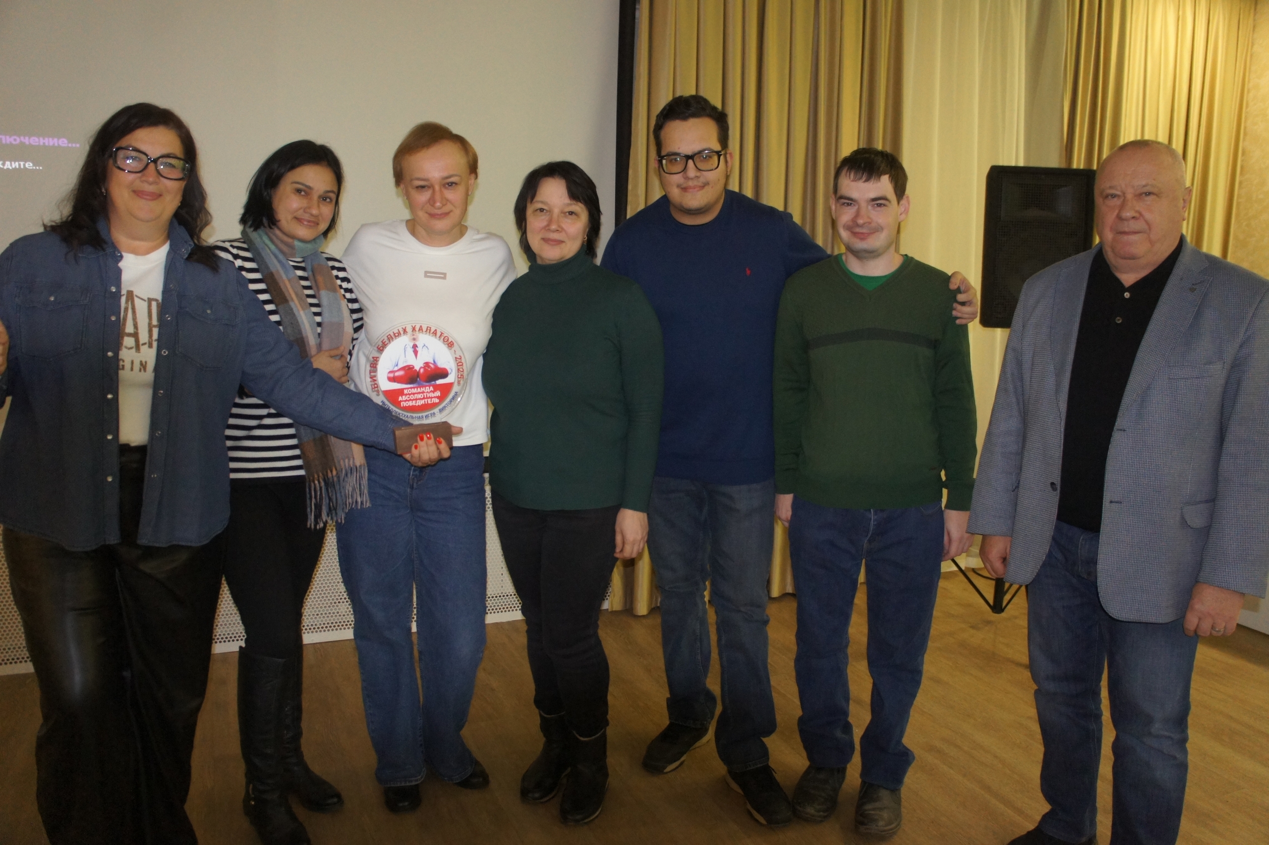 Председатель обкома Профсоюза Сергей Быструшкин, проводивший процедуру награждения, тепло поздравил победителей финальной игры-викторины, бессменного модератора игры Тимура Таужанова и всех игроков интеллектуального клуба «Битва белых халатов» с окончанием сезона игр 2025 года и дал старт новому сезону 2026 года.