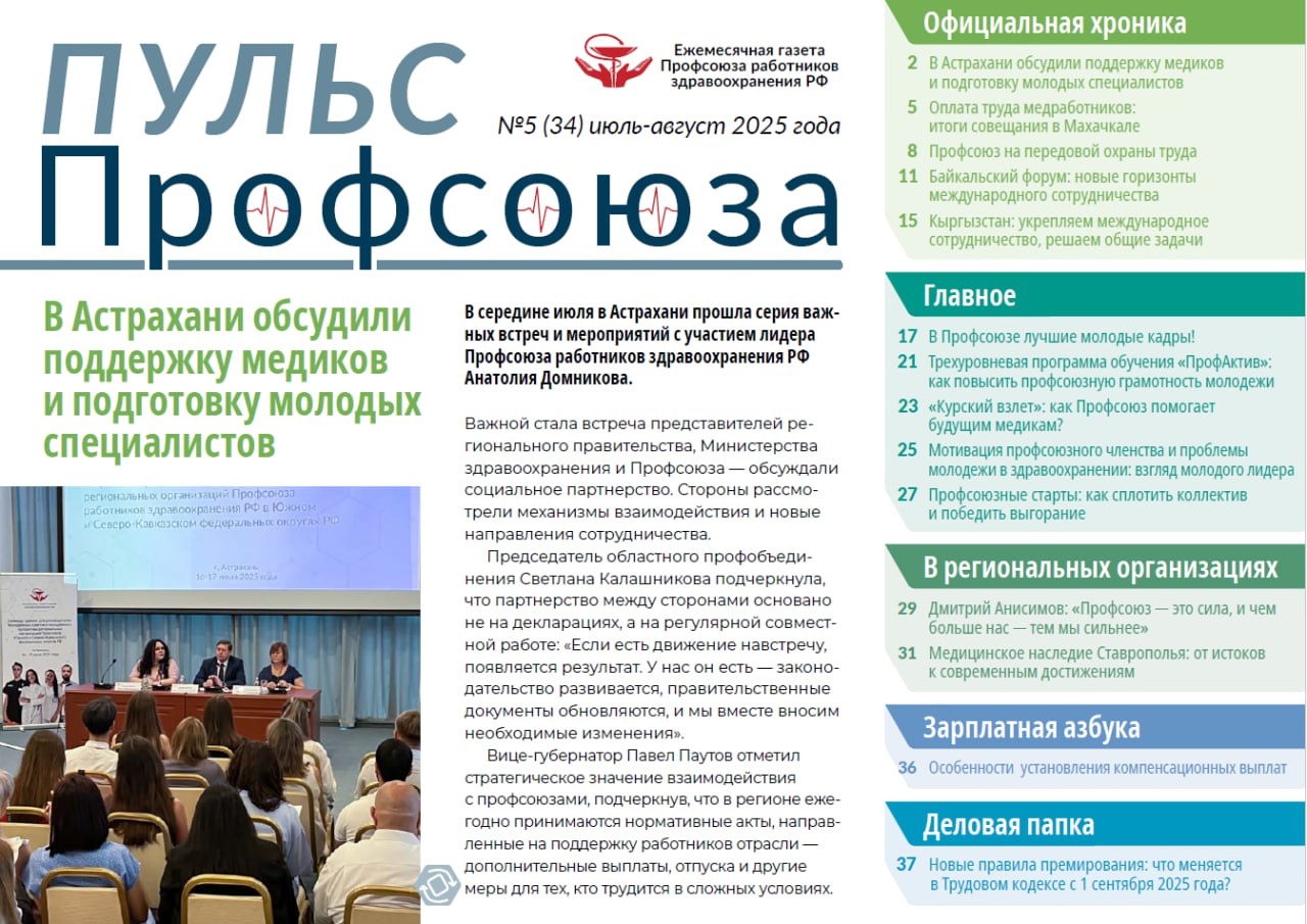 Уважаемые читатели! Жаркие летние месяцы выдались насыщенными у Профсоюза! В фокусе внимания — развитие международного сотрудничества, социального партнёрства и работа с молодёжью. Обо всём этом «Пульс Профсоюза» рассказывает в «Официальной хронике». А вот в разделе «Главное» мы полностью предоставляем площадку молодёжи: финалисты конкурса «Молодой профсоюзный лидер здравоохранения России — 2025» делятся своими достижениями в первичных и региональных организациях, размышляют о новых вызовах и трендах в профсоюзном движении, а также предлагают свои идеи для развития.