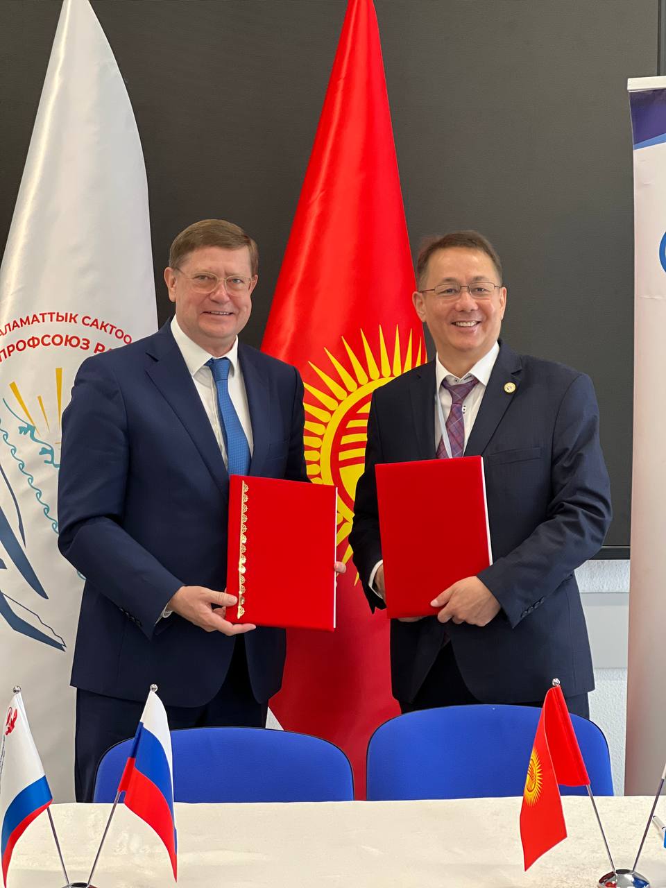 Трёхлетнее соглашение о сотрудничестве заключили сегодня в Бишкеке отраслевые профсоюзы России и Кыргызстана. Подписи под документом поставили председатель Профсоюза Анатолий Домников и его кыргызский коллега Султан Абдыкадыров.