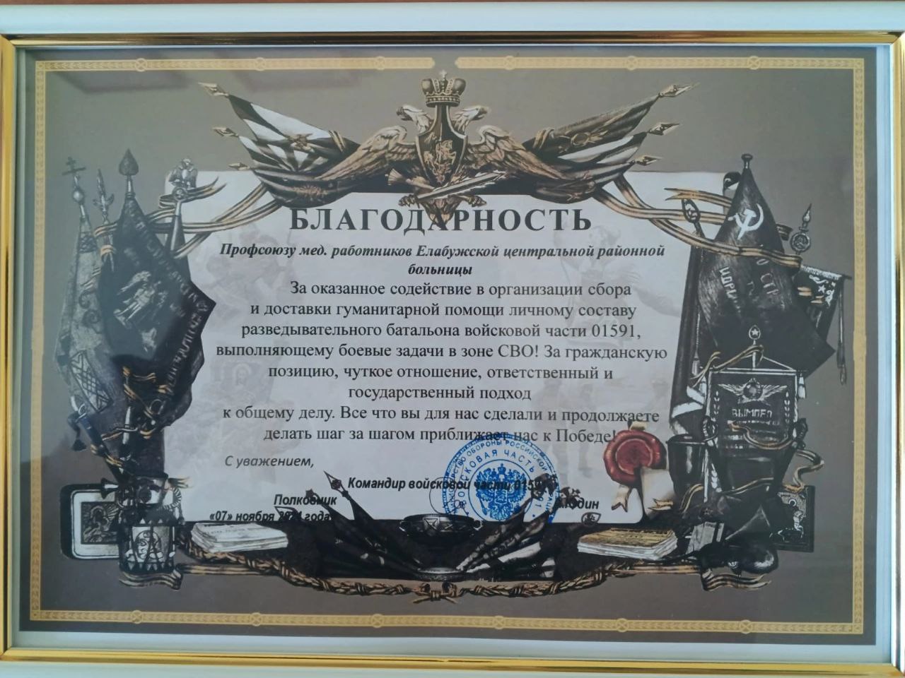 Тем временем профсоюзный комитет ЦРБ получил очередную благодарность из зоны СВО. Её вручили за оказанное содействие в организации сбора и доставки гуманитарной помощи личному составу разведывательного батальона войсковой части 01591, выполняющему боевые задачи в зоне СВО.