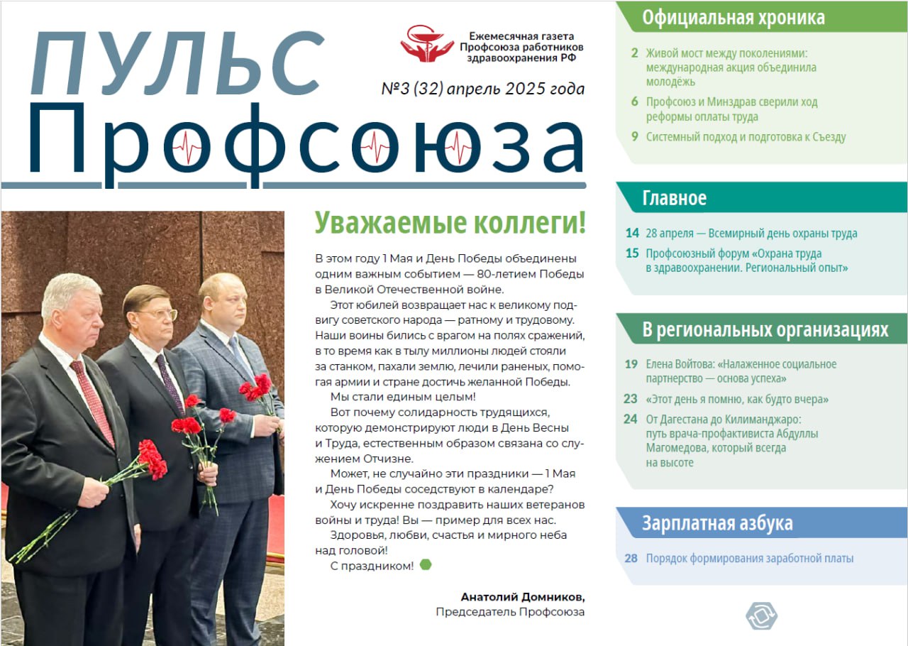 Старт "Маршрута Добрых дел" в Москве и совместное с Минздравом совещание в Благовещенске, поздравления с 1 и 9 мая и напоминание про Всемирный день охраны труда, а в, казалось бы, стандартном отчёте о решениях Президиума Профсоюза ищите настоящие жемчужины – ссылку на прекрасный музыкальный сборник участников Фестиваля патриотической песни и новый творческий конкурс на лучшее исполнение гимна Профсоюза.