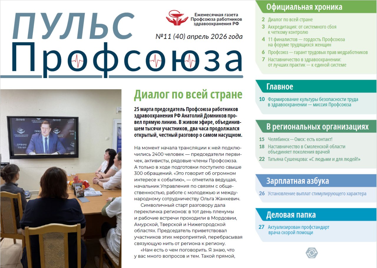 Главная тема апрельского номера «Пульса Профсоюза» напрямую касается каждого медицинского работника — культура безопасного труда. 28 апреля весь мир отмечает Всемирный день охраны труда. Работники здравоохранения, ежедневно находятся в группе наивысшего риска, и забота о безопасности, здоровье и достойных условиях труда — одна из главных задач Профсоюза.