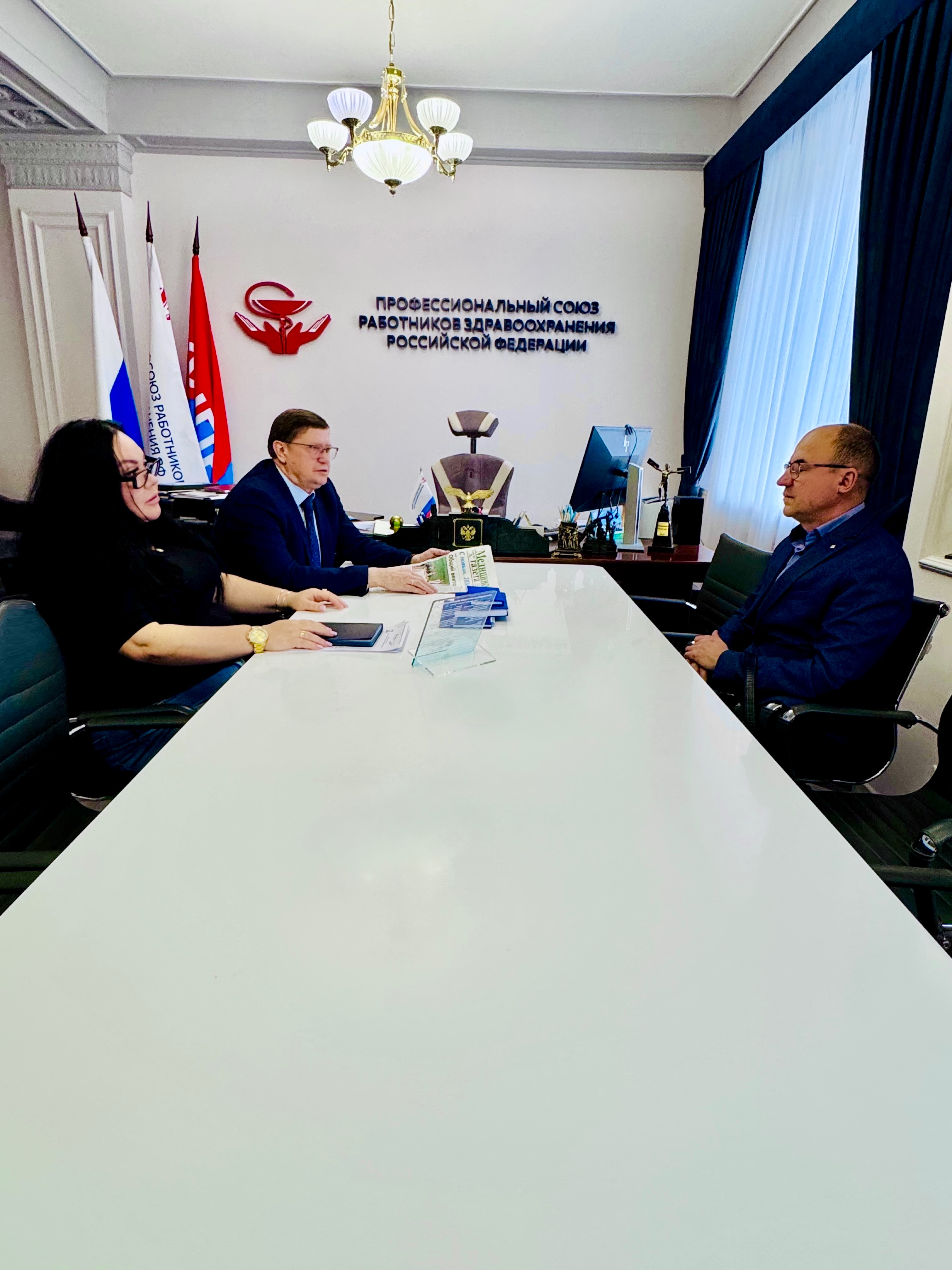 В штаб-квартире Профсоюза сегодня состоялась рабочая встреча председателя нашей организации Анатолия Домникова и начальника Управления по связям с общественностью, работе с молодёжью и международному сотрудничеству Ольги Жанкевич с главным редактором «Медицинской газеты» Алексеем Папыриным.