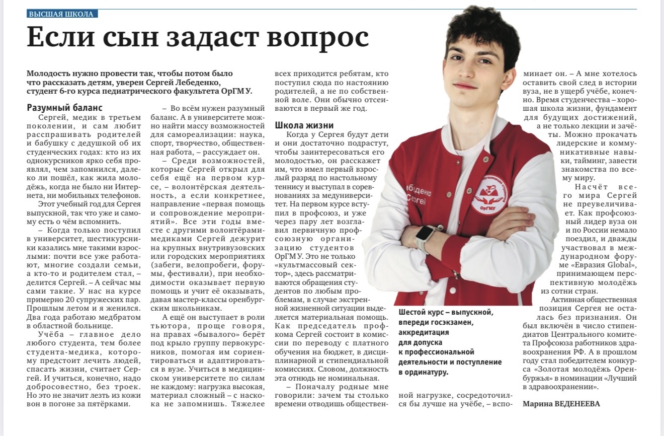 В преддверии Дня студента Сергей Лебеденко, председатель первичной профсоюзной организации студентов Оренбургского государственного медицинского университета и студент-шестикурсник педиатрического факультета, распахнул двери своей студенческой юности для журналистов газеты «Оренбуржье», поделившись яркими воспоминаниями и опытом общественной жизни.