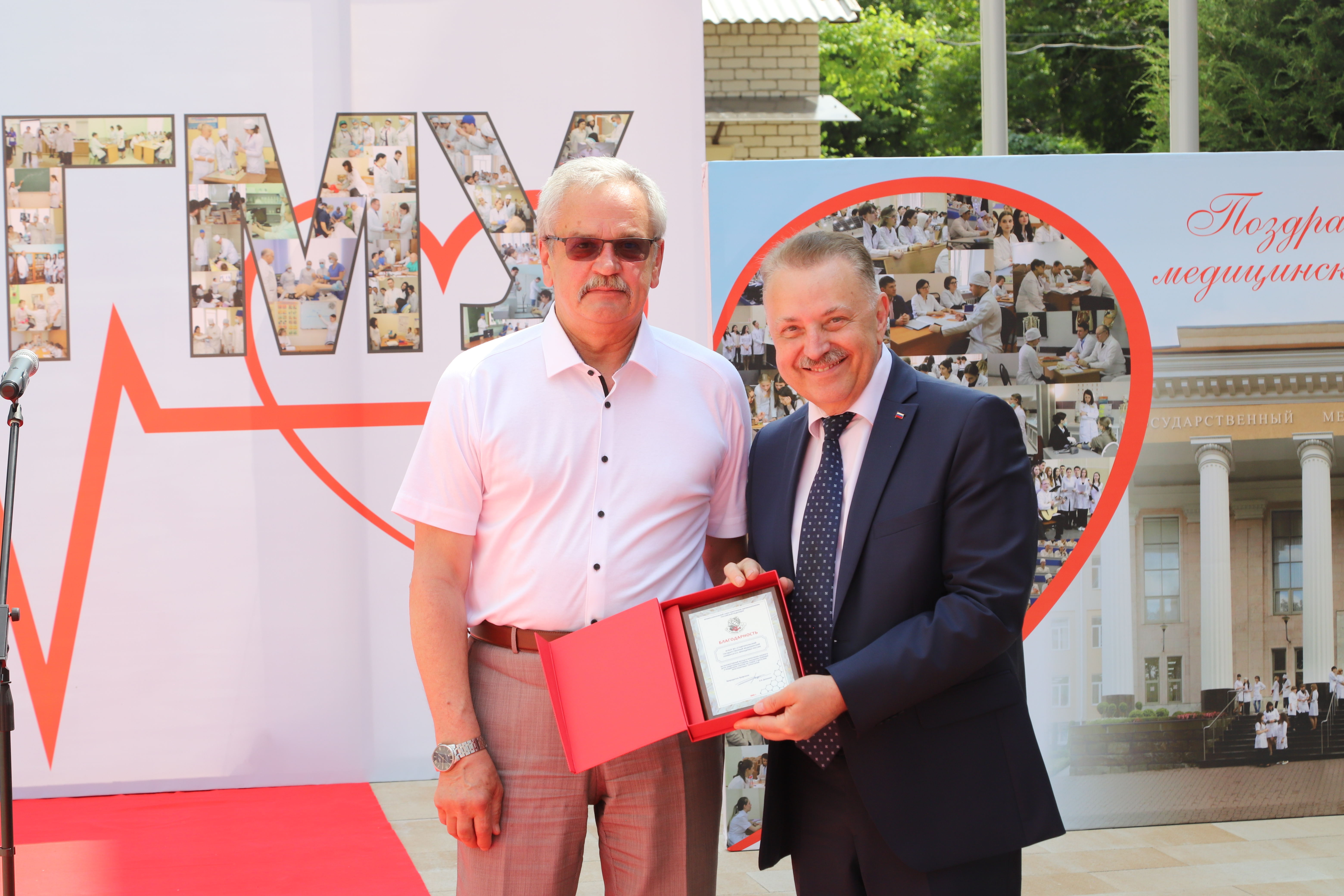 На торжественном мероприятии в ФГБОУ ВО «Ставропольский государственный медицинский университет» Минздрава России председатель Ставропольской краевой организации профсоюза работников здравоохранения РФ Александр Кривко вручил ректору Ставропольского государственного университета Виктору Николаевичу Мажарову Благодарность Профсоюза работников здравоохранения РФ за коллективный вклад в укрепление боевого духа защитников Родины, оказание помощи и поддержки членам их семей и жителям приграничных территорий.