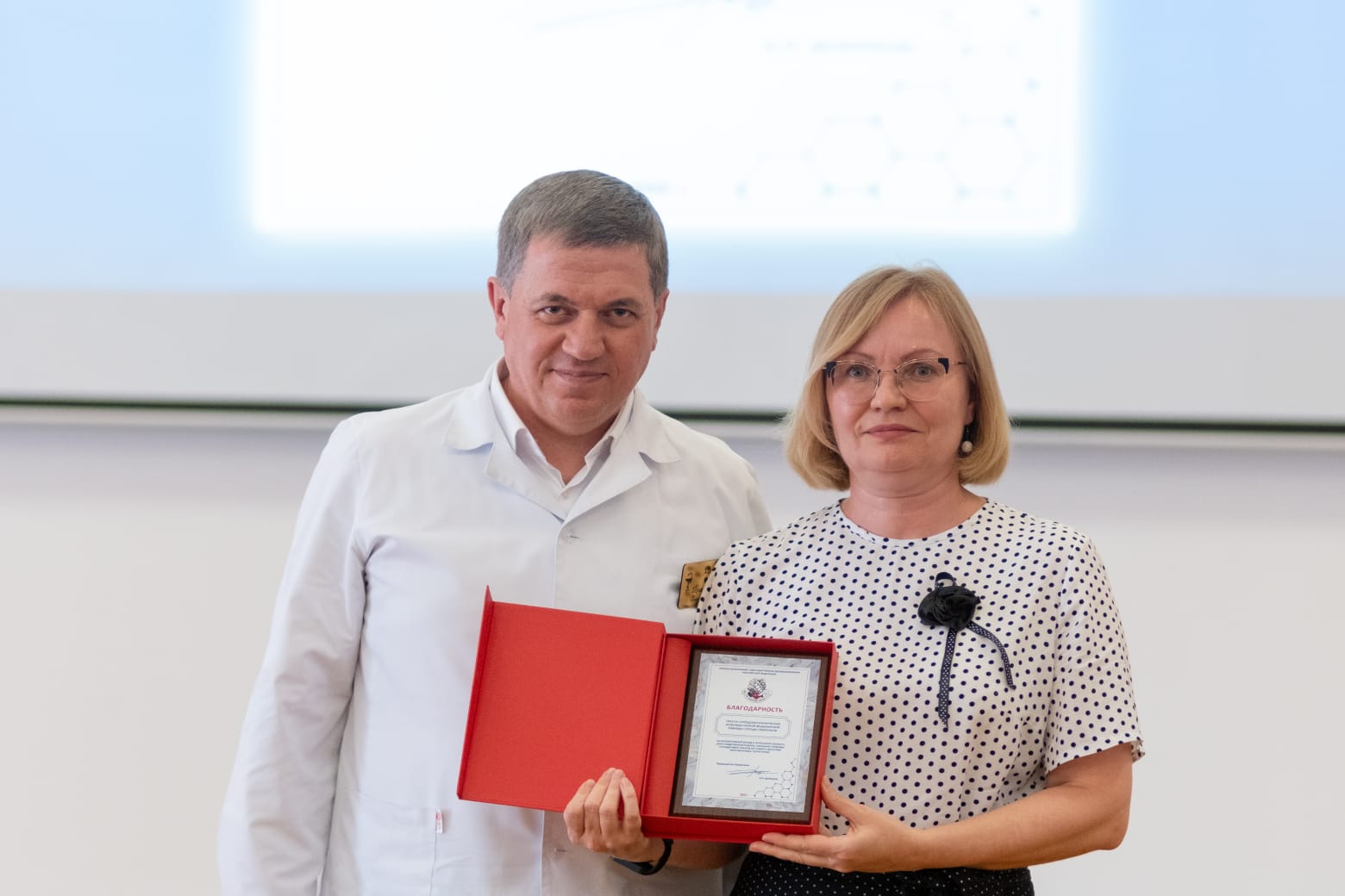 В ГБУЗ СК «Городская клиническая больница скорой медицинской помощи» города Ставрополя председатель первичной профсоюзной организации Ольга Масальская вручила главному врачу Одиссею Гераклитовичу Хаджиеву Благодарность Профсоюза работников здравоохранения РФ за коллективный вклад в укрепление боевого духа защитников Родины, оказание помощи и поддержки членам их семей и жителям приграничных территорий.
