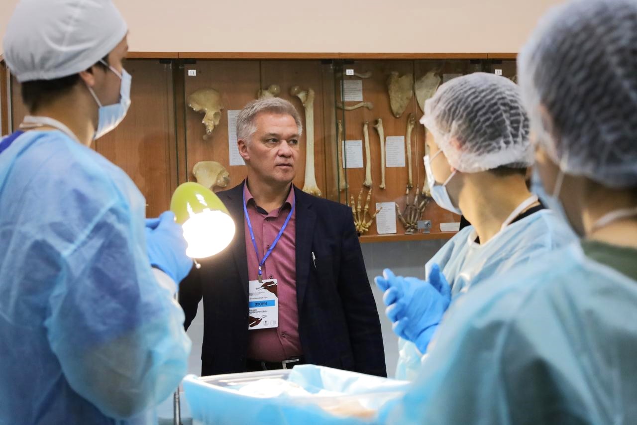 На фото: Андрей Ивченко со своими студентами во время проведения внутривузовской Олимпиады по хирургии в октябре 2025 г.