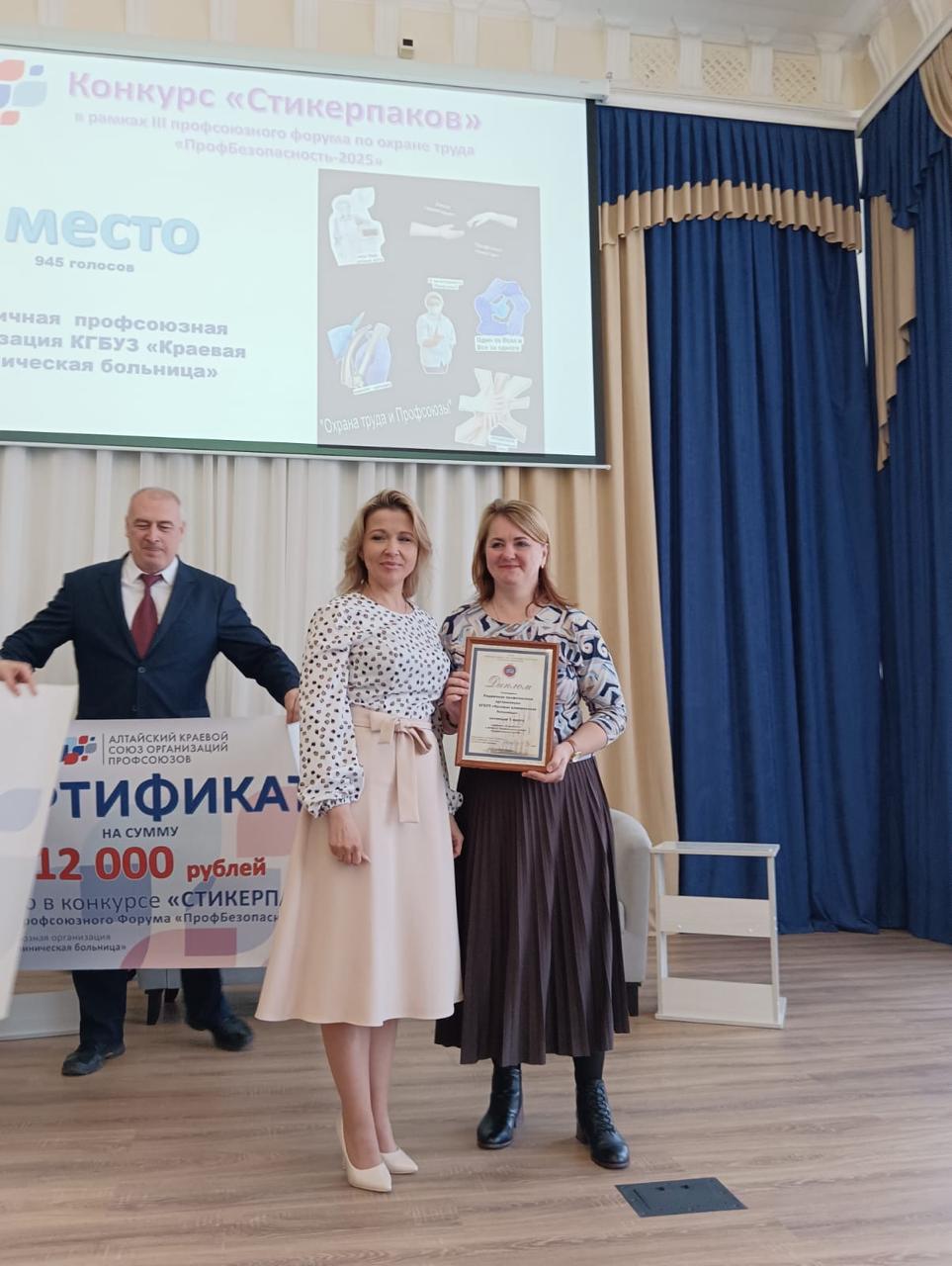 В рамках мероприятия прошло награждение победителей конкурса «СТИКЕРПАКОВ». Первичная профсоюзная организация КГБУЗ «Краевая клиническая больница» заняла первое место в этом конкурсе. Члены профгруппы отделения анестезиологии-реанимации, ответственные за ведение пациентов кардиохирургического профиля, во главе со старшей медицинской сестрой Суходаевой Мариной проявили исключительную активность и творческий подход к созданию «стикерпаков» на заданную тематику.